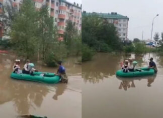 В затопленном российском городе нарядным первоклашкам организовали заплыв до школы